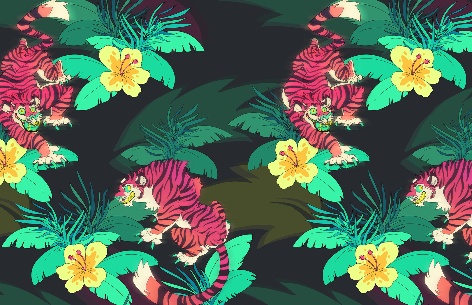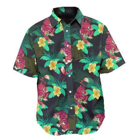 A button down "Hawaiian Shirt" featuring a hot pink tiger in a neon jungle.