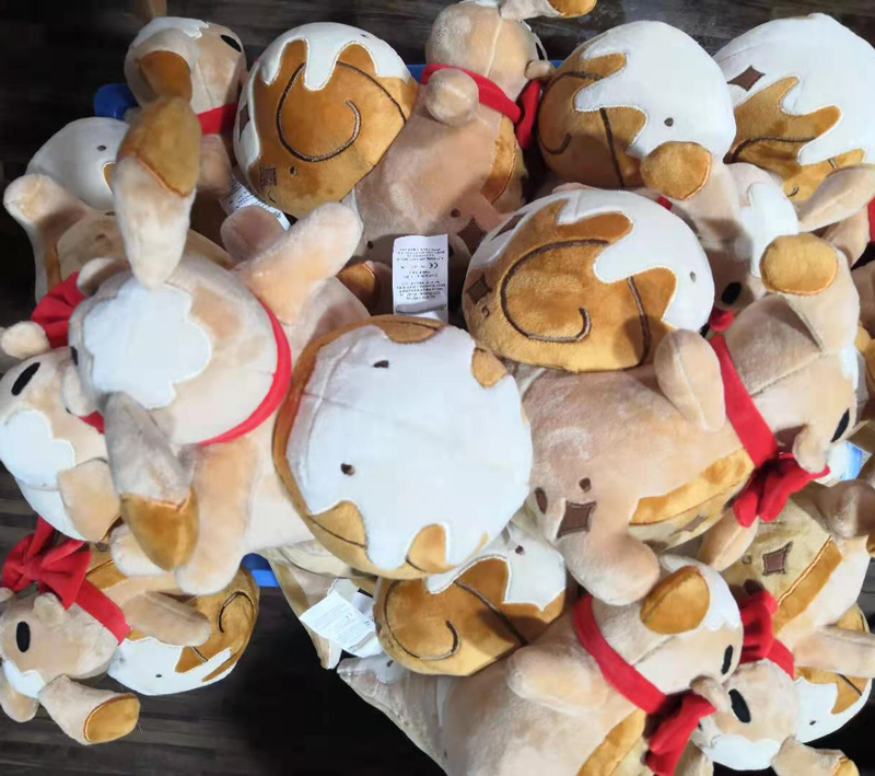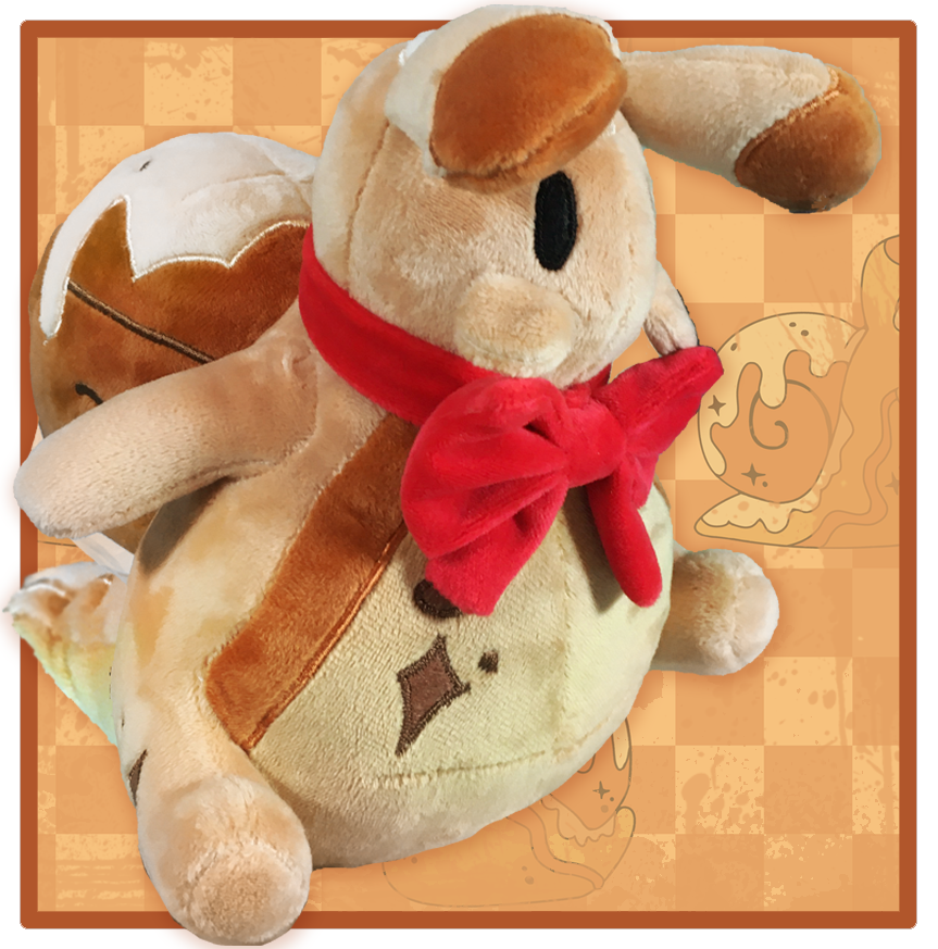This plush is quite a solidly built little guy, making great use of the 8 inch size limit by being nearly as long and wide as it is tall, with a firm, well-stuffed shell and body that give it a nice sense of weight. It's made of soft minky fabric, with a little red bow around its snaily neck and embroidered cinnamon sparkles.