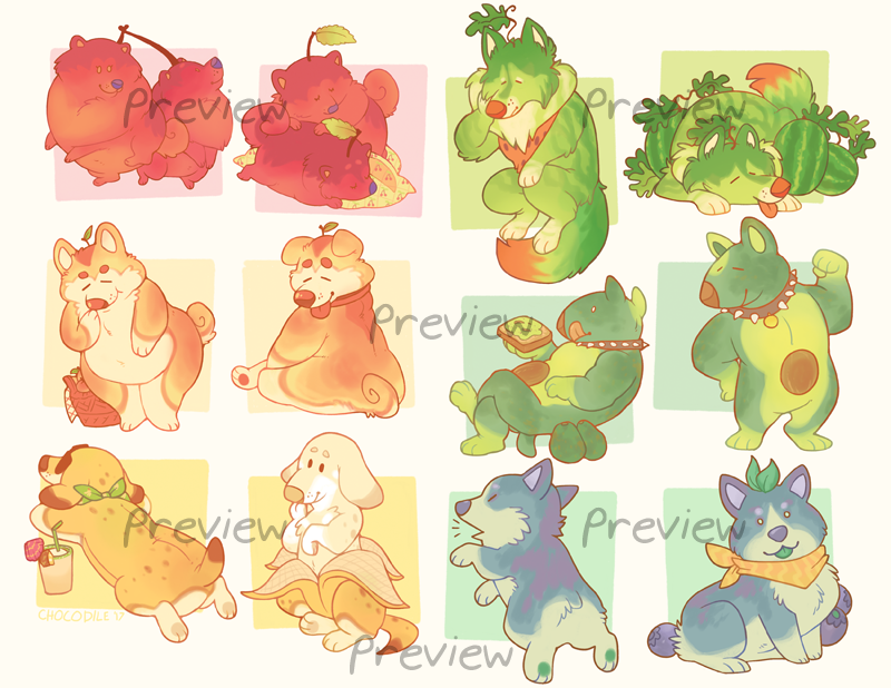 Dogs + Fruit! Cherry Pom, Peach Inu, Bananahund, Melon Collie, Avocadog, and Blue Corgberry.