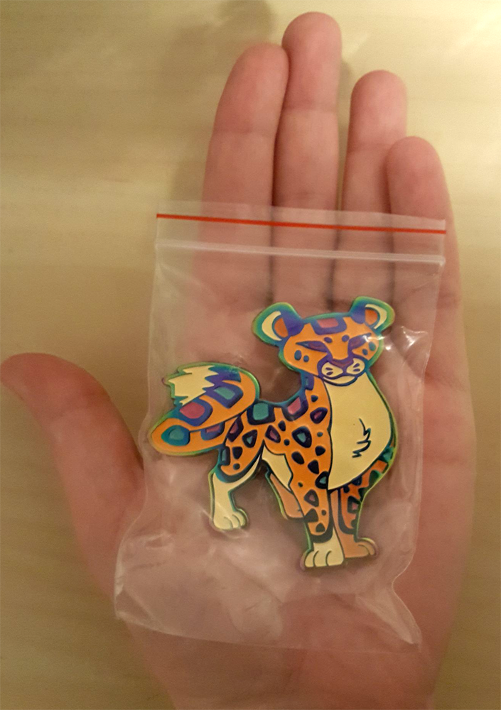 A jumbo-sized rainbow anodized metal pin featuring an ocelot.