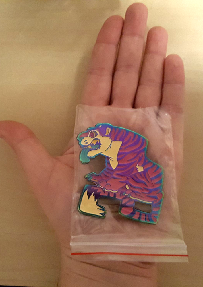 A jumbo-sized rainbow anodized metal pin featuring a tiger.