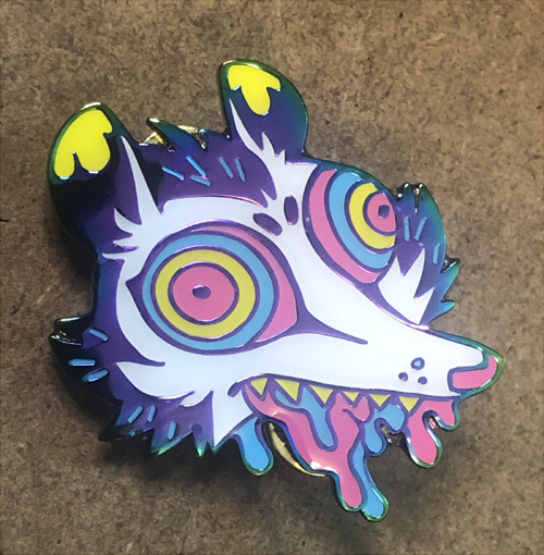 A rainbow anodized metal pin featuring a colorful and melty opossum.